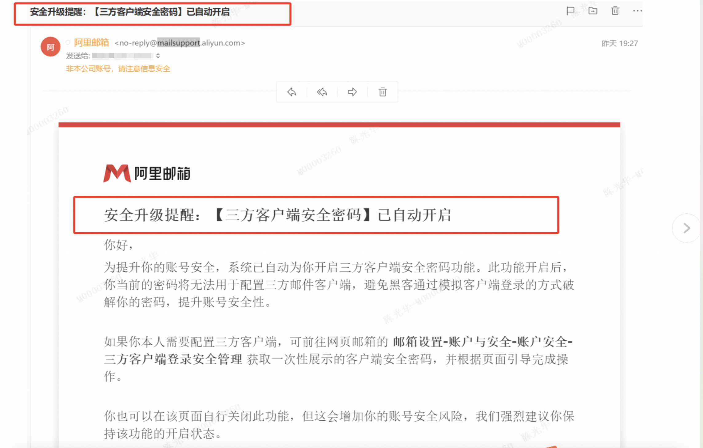 安全防护方面,阿里邮箱现在增加了1个月内没有任何成功登录的邮箱,后台会把对应账号的三方客户端安全密码做开启并通过邮件通知到用户,目前是放量中。