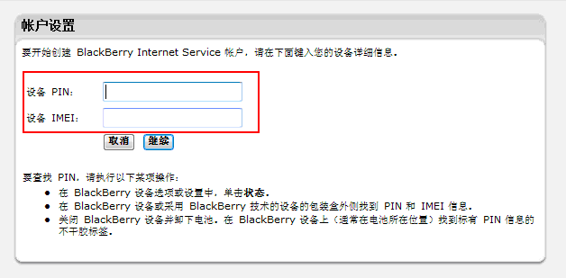 输入相应的的黑莓手机设备信息后,单击 继续 ,直至帐户创建成功。