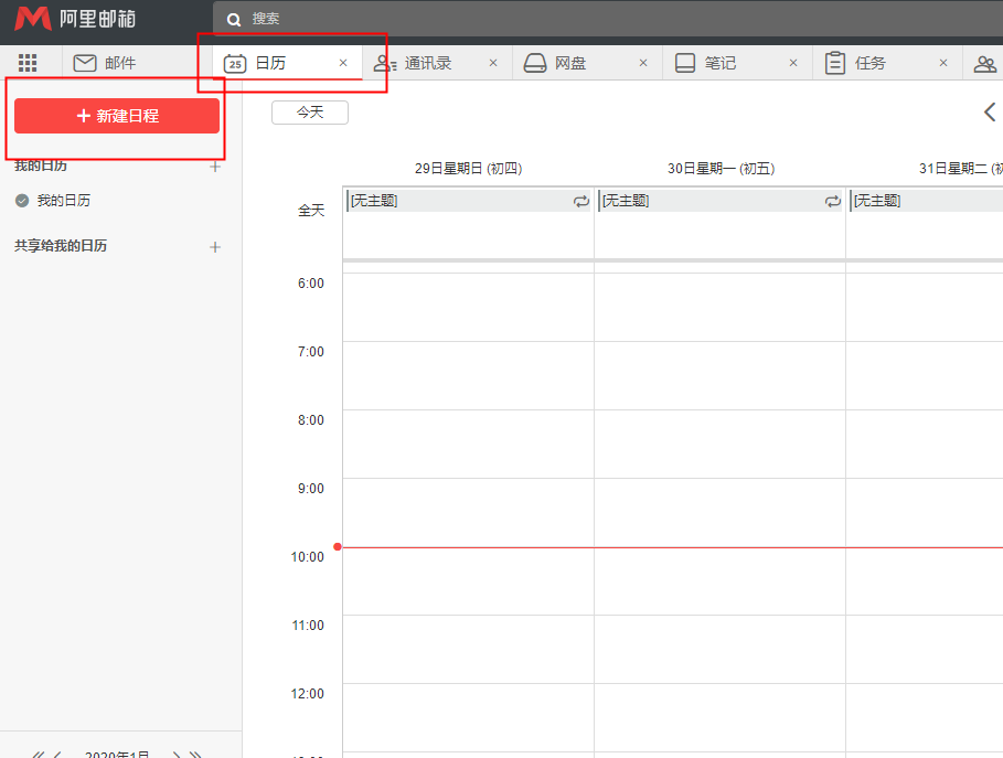 1、登录邮箱,点击左下角的“日历”按钮,然后点击左上角“新建日程”后,打开会议邀请的页面。